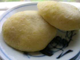 This is a soft, round rice cake stuffed with sweet bean jam. Daifuku is sold at Nakaya-manju in Sawatari Onsen town. There are light yellow grains baked into the cake which go well with the sweet bean jam. There are mixed sets of both daifuku and onsen manju available.